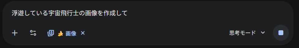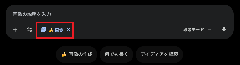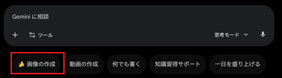 画像生成機能を使うには、まず「🍌画像を作成」を選択してください。その後、モデル選択メニューが表示されるので、そこで「思考モード」に切り替えることができます。デフォルトでは「高速モード」になっているため、切り替えを忘れないよう注意しましょう!