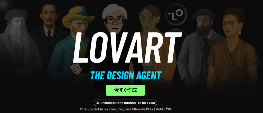 | Lovart.ai | 完全無料・無制限(期間限定) | ◯ | 今すぐ無制限で試したいならココ! |