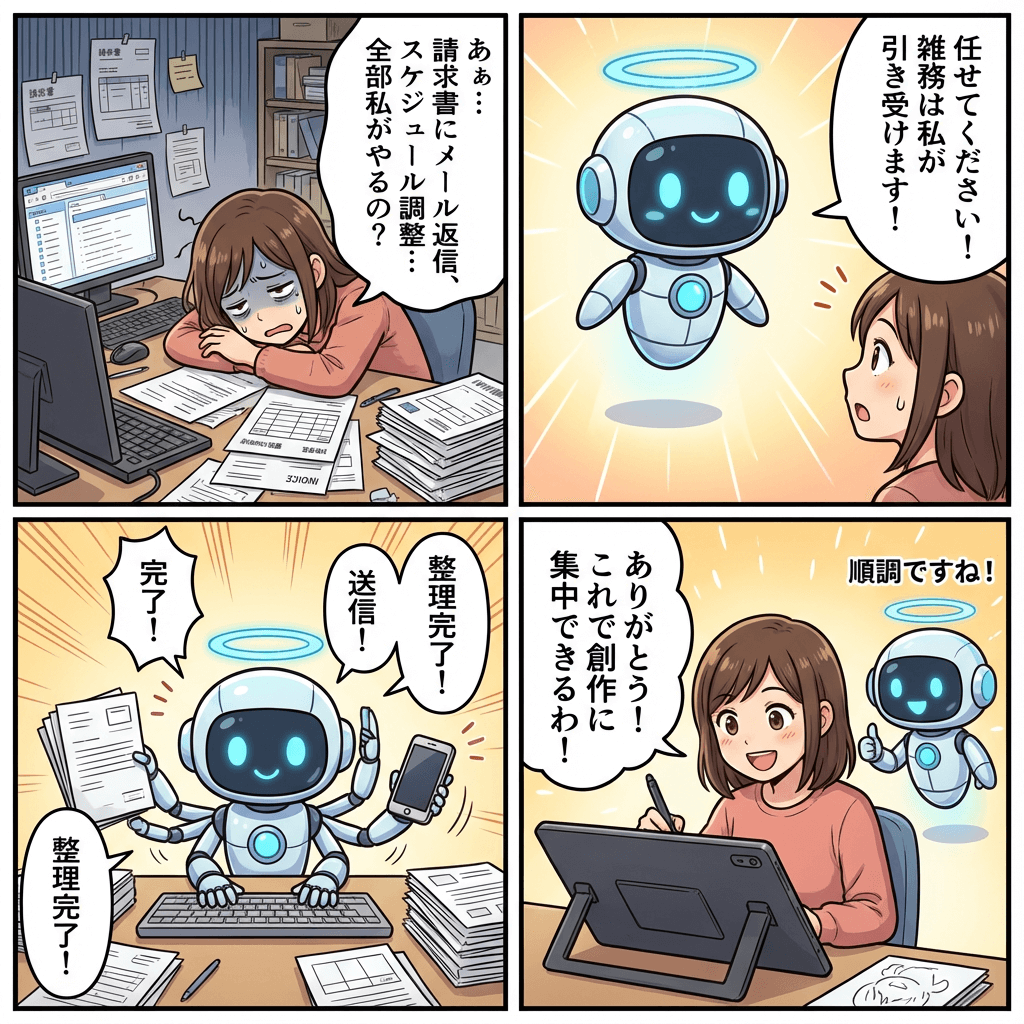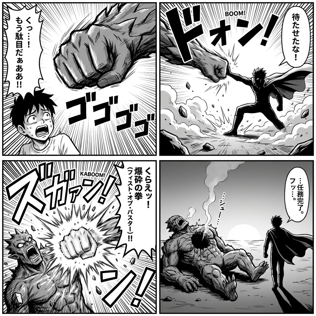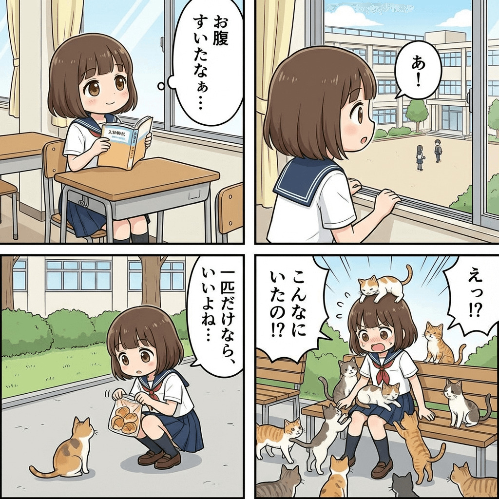 プロンプト(指示文)を工夫すれば、少年漫画風・少女漫画風・日常系4コマなど、様々なスタイルの4コマ漫画を生成できますよ!