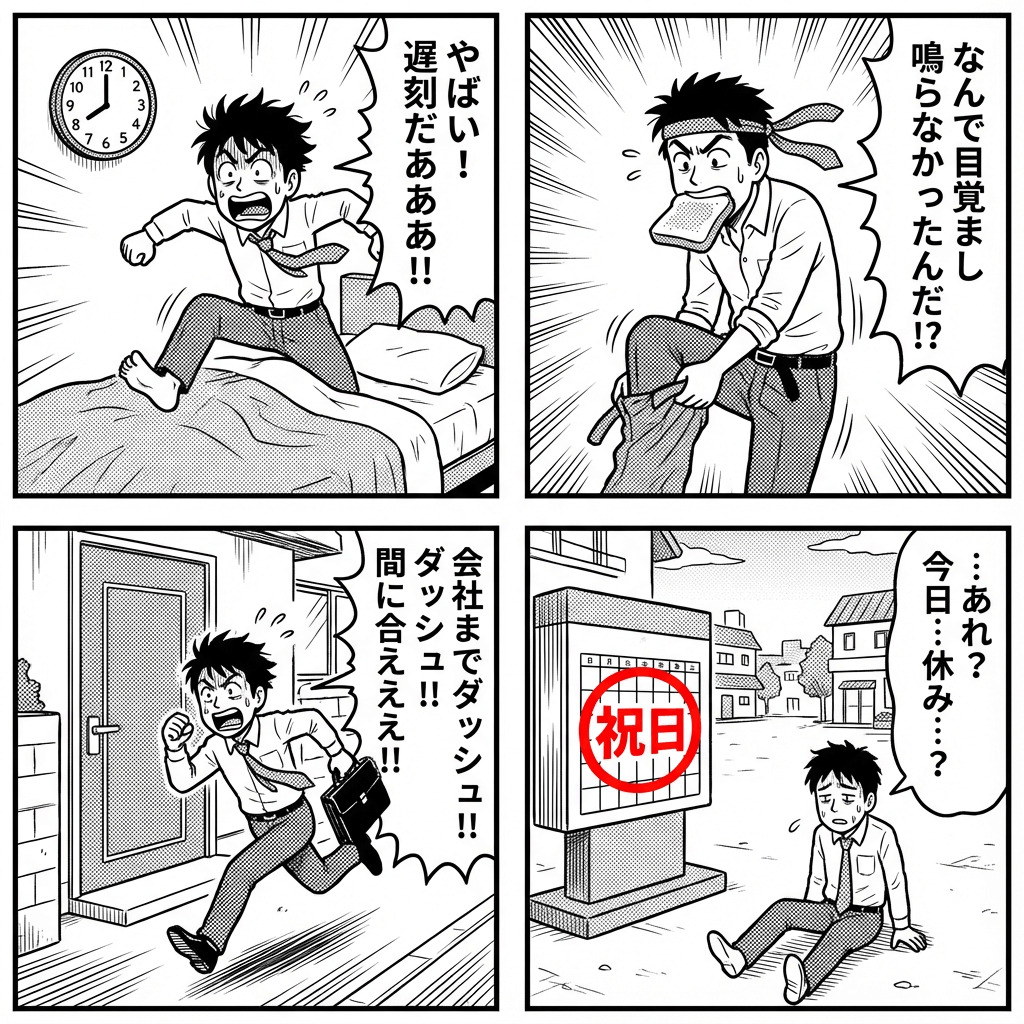 4コマ漫画を作成してください。右上から左下へ読む日本の漫画レイアウトで。