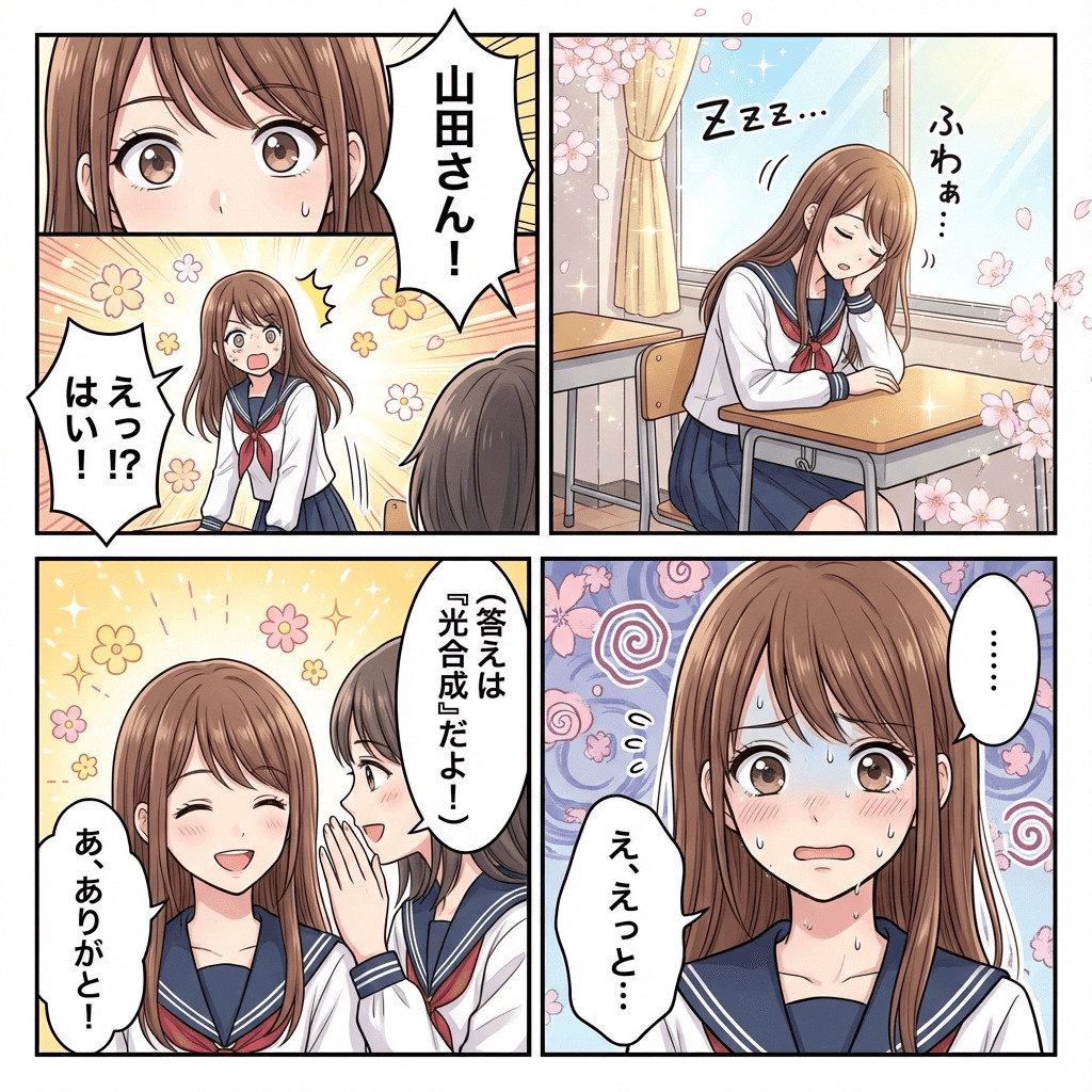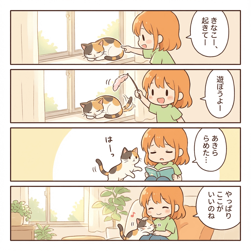 セリフは全て日本語で。日常系4コマ漫画風の柔らかいタッチでお願いします。