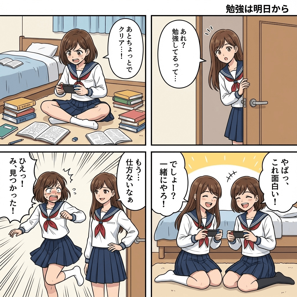 ②コマ間で画風が微妙にズレることがある:特に、1コマ目とそれ以降のコマで情報密度に差が出ることがあります。例えば、1コマ目は背景が細かく描き込まれているのに、2コマ目以降は背景が簡素になってしまう、といったケースですね。気になる場合は、プロンプトで「全てのコマで統一した画風にしてください」と追記すると改善されることがあります。