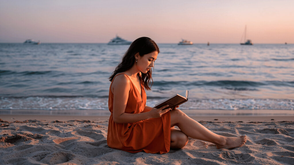 例えば、「夕暮れ時の海辺で、オレンジ色のワンピースを着た女性が本を読んでいる。背景にはヨットが見え、柔らかい光が差している」といった詳細な指示でも、しっかり理解して再現してくれます。