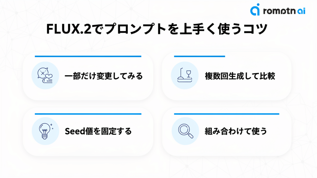 FLUX.2は英語での学習データが圧倒的に多いため、英語でプロンプトを書く方がイメージ通りの画像を生成しやすいです。英語が苦手な方は、Google翻訳やChatGPTで翻訳してから使うのがおすすめですよ。