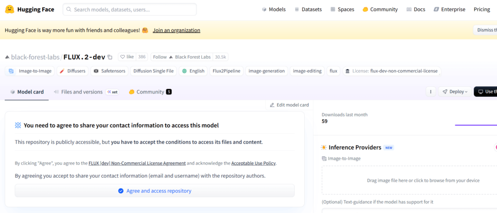 ②Hugging Faceで試用:Hugging Faceなら、ログイン不要で無料でFLUX.2を試せます。ただし、無料なので混雑時は待ち時間が長くなったり、生成枚数に制限があったりします。「ちょっと触ってみたい」という方には十分ですね。