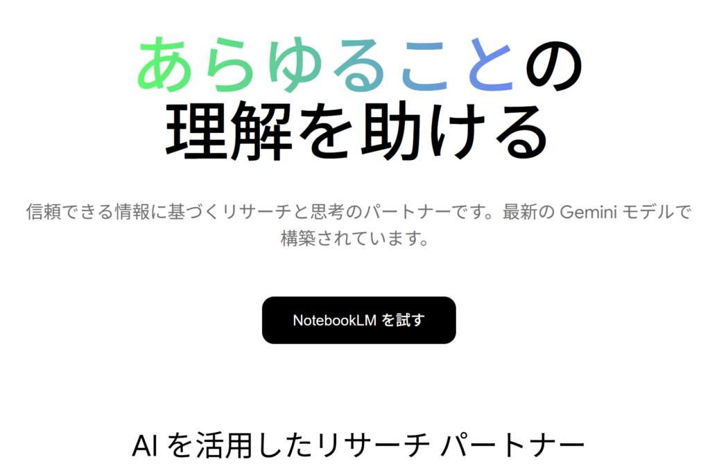 まずはGoogleアカウントにログインした状態でWeb版のNotebookLMにアクセスし、「NotebookLMを試す」をクリックします。