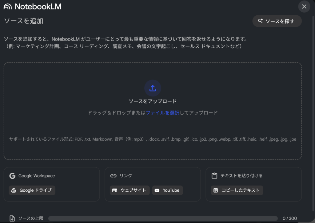ノートブックが開くと、最初にソースを追加する画面が表示されます。ここで、スライド・インフォグラフィックのもととなる資料をアップロードします。