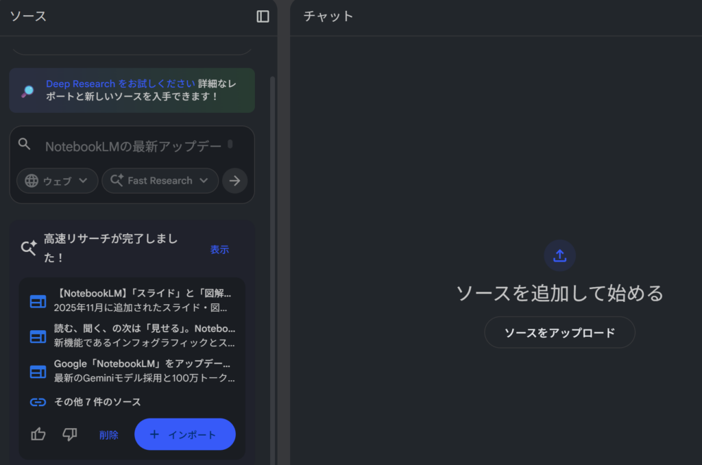 「Fast Research」または「Deep Research」機能を使ってウェブ上の情報を収集し、内容を確認してインポートします。