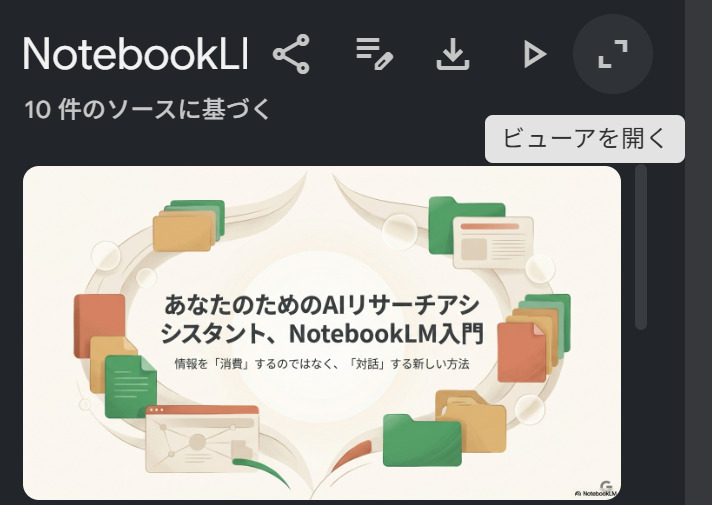 処理が完了したら、生成されたスライド・インフォグラフィックをクリックしたら、生成物が表示されます。スライドは「ビューアを開く」から拡大できます。