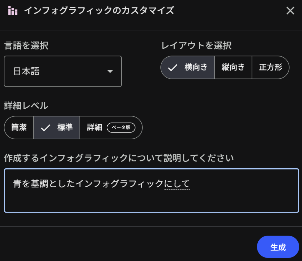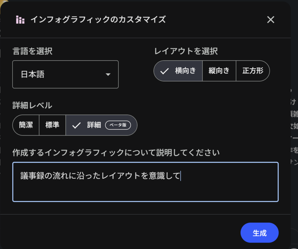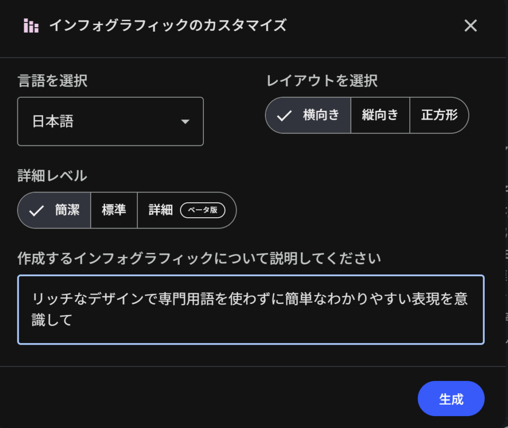 また、「インフォグラフィック」の場合は以下のように「言語」「レイアウト」「詳細レベル」「カスタムプロンプト」を指示して「生成」をクリックします。