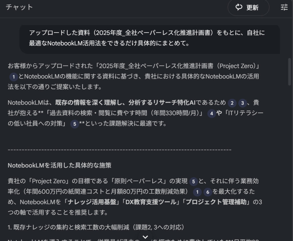 Webの情報と社内資料がアップロードできたら、NotebookLMのチャットで自社用に情報をまとめてもらいます。
