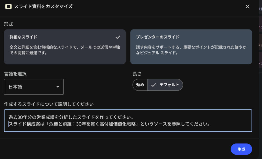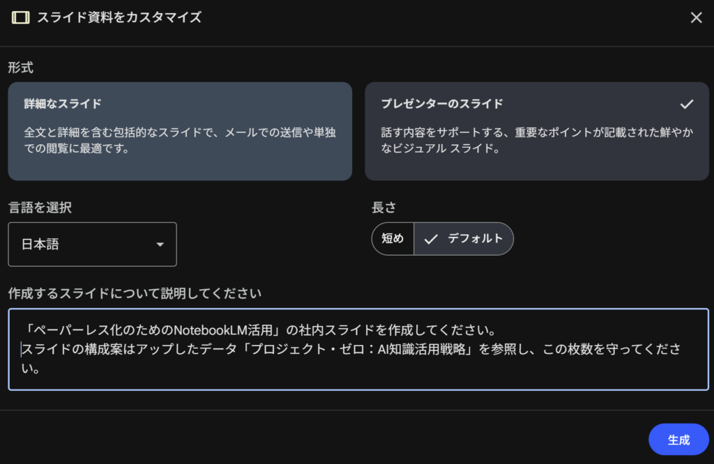 最後にStudioの「スライド資料」のペンのマークをクリックします。そこで形式や長さを選択して、以下のようなカスタムプロンプトを入力します。「生成」をクリックすると10分くらいでスライド資料が完成します。