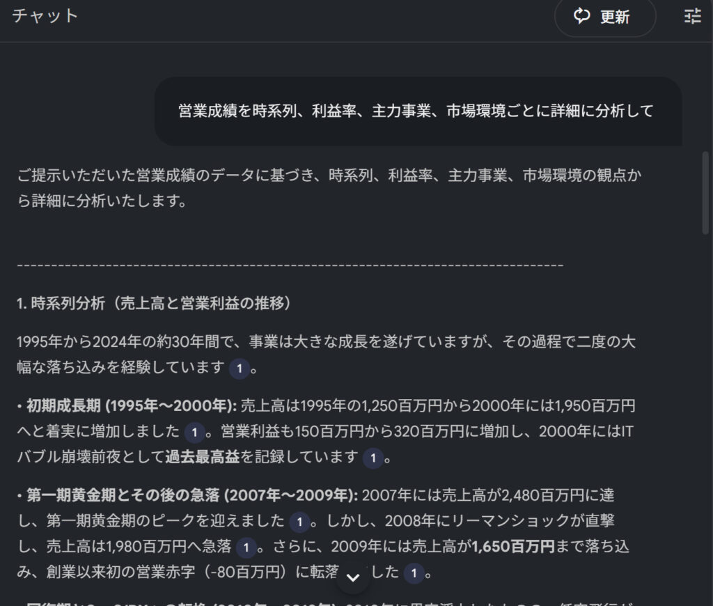 アップロードできたら、以下のようにチャットで数値データを詳細に分析してもらいます。