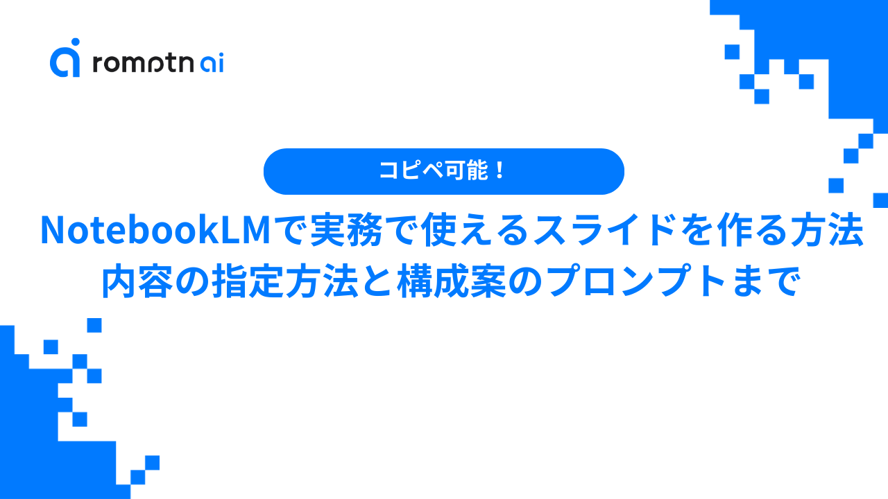 この記事では、NotebookLMのスライド生成を実務で使える形に近づけるために、内容・構成を先に固める手順と、用途別の構成案プロンプト、生成回数の上限、トラブル時の対処法を解説しました。