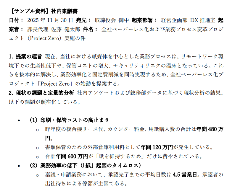 今回は、Gemini3に簡単なペーパーレス化推進計画書を作ってもらい、アップロードしてみます。