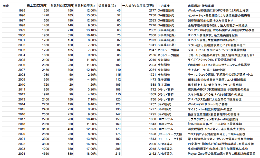 #指示 あなたは世界的なコンサルティングファームのデータストラテジスト兼クリエイティブディレクターです。 提供されたデータを分析し、その劇的な変革の歴史と未来への指針を示すプレゼン資料構成を作成してください。 #ターゲット 経営層および全社員 #全体構成の指示(全15枚) 単なる数値報告ではなく、「危機からの再生と、高付加価値化への挑戦」というストーリーラインで構成してください。 ・Introduction: 30年の旅路(OA機器からAIへ)。創業以来最高益(2024)の発表。 ・The Timeline (Overview): 30年間の売上・利益推移の全体像。4つのフェーズ(創業期、停滞・危機、回復、飛躍)の定義。 ・The Crisis (Reality): 2008-2009年のリーマンショックと初の営業赤字。生存をかけたコスト削減の痛み。 ・The Pivot (Turning Point 1): 2010年代のクラウド/SaaSシフト。ビジネスモデル転換による利益率の徐数的な回復。 ・The Acceleration (Turning Point 2): 2020年以降のコロナ禍・DX・AI特需。「労働集約」から「知的集約」への完全移行。 ・The Productivity (Key Drivers): 従業員一人当たり生産性の推移分析(2009年の底値1473万円から2024年の2162万円へ)。 ・Future Strategy (Benefit): AI・IoT導入の次に目指すべき「ポスト2025」の戦略。 ・Conclusion: 次の30年に向けたミッションステートメント。 #出力フォーマット 各スライドについて、以下の項目をプレーンテキスト形式で出力してください。 ・タイトル: (数字を入れた具体的かつ洗練されたコピー。例:「赤字からの脱却:2009-2010」) ・メインメッセージ: (データから導かれる断定的な洞察) ・ボディテキスト: (CSVの「特記事項」の内容を織り交ぜた具体的な事象と数値の要約) ・グラフ: どのデータをX軸・Y軸にとるか具体的に指定(例:売上高(棒グラフ)と営業利益率(折れ線)の複合チャート) ・デザイン: 「高級感・スマート」を体現する演出(例:重要な転換点である2009年と2024年をゴールドでハイライト、それ以外はモノトーンなど) #制約条件(スタイル) ・トーン&マナー:High-End, Sophisticated, Dramatic ・禁止事項: 「売上が上がりました」等の小学生並みの感想 コンテキスト(市場環境・特記事項)を無視した数値の羅列 過度な装飾でデータが見えなくなること回答が生成されたら、こちらも先ほどと同じように「メモに保存」→「ソースに変換」をクリックします。