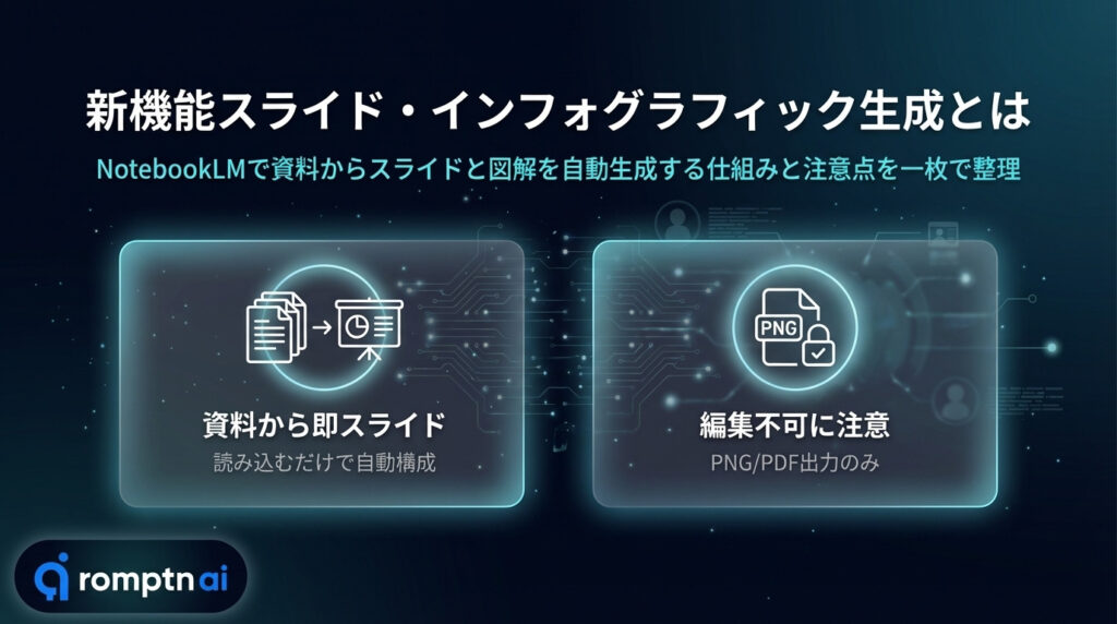 この記事では、NotebookLMの新機能であるスライド・インフォグラフィック生成の使い方や制限、実務での活用法について解説しました。