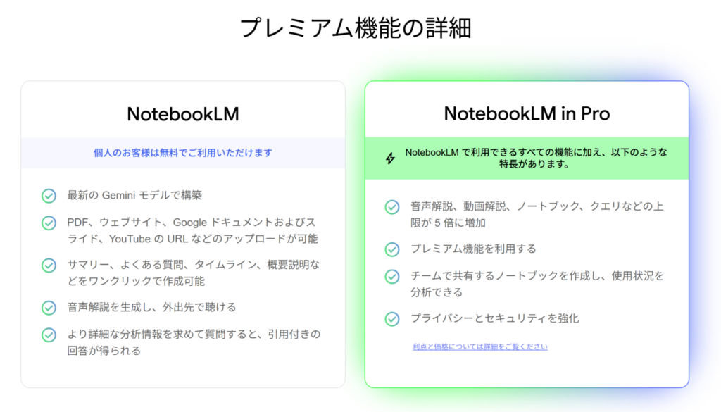| 項目 | 無料プラン(NotebookLM) | 有料プラン (NotebookLM in Pro ) |