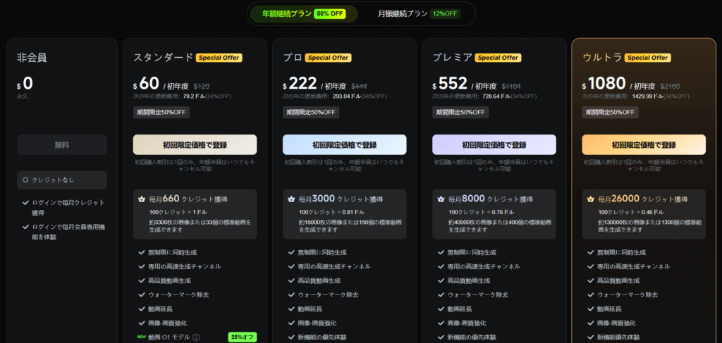 | Kling O1 Image | ・クレジット制(従量課金) ・高品質モードのみ対応 ・動画参照時は1.5倍のクレジット消費 ・期間限定25%OFFキャンペーン実施中(2025年12月時点) |