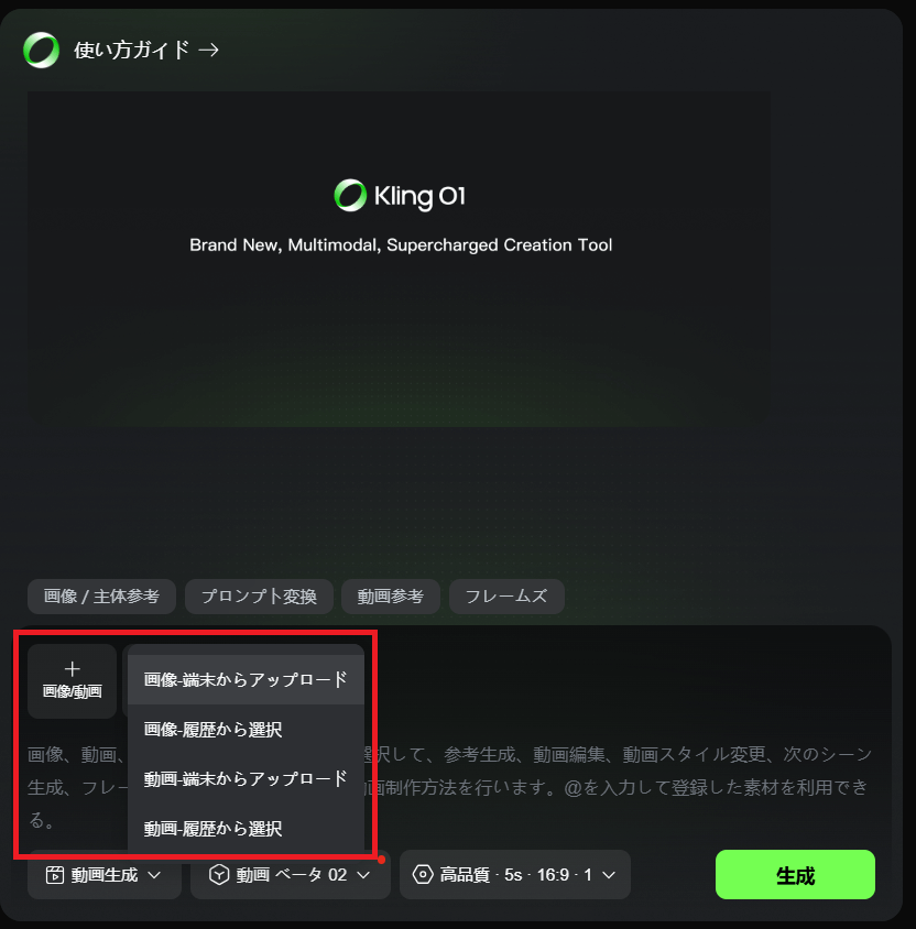| 動画を参照にした生成 | 動画素材を入力として使用する場合は、通常の1.5倍のクレジットが必要になる→動画データの処理負荷が高いため |