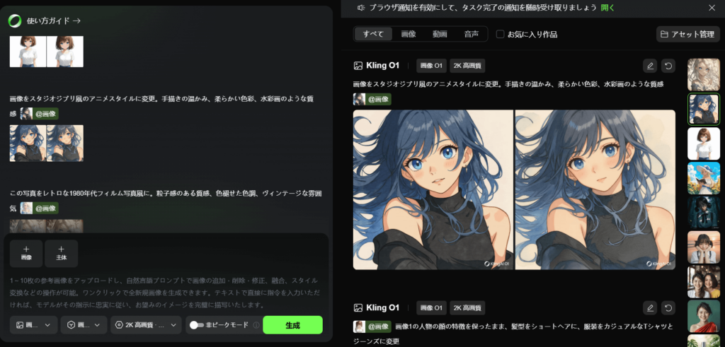 Kling O1 Imageの最大の強みは、最大10枚の参照画像を同時に読み込んで、キャラクターの特徴を正確に保ちながら画像生成できるという点です。