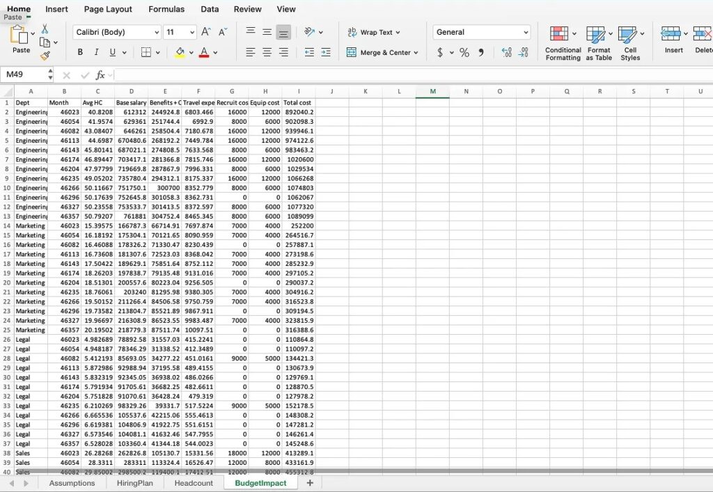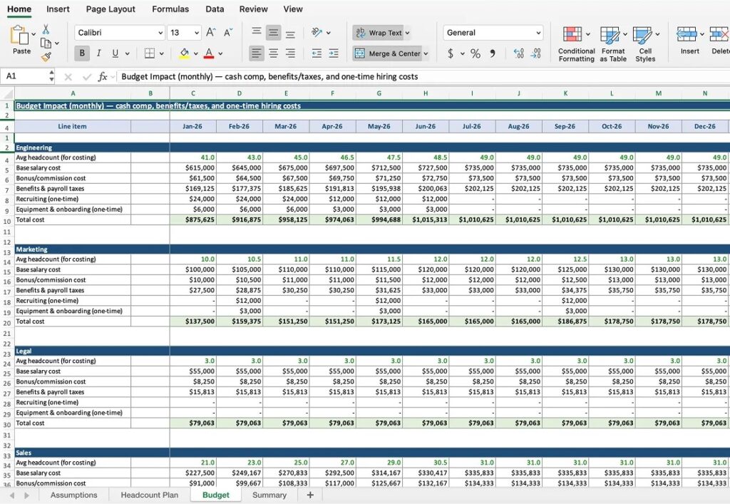 人員計画モデルを作成してください。ヘッドカウント、採用計画、離職率、予算への影響を含め、エンジニアリング、マーケティング、法務、営業部門を対象とします。