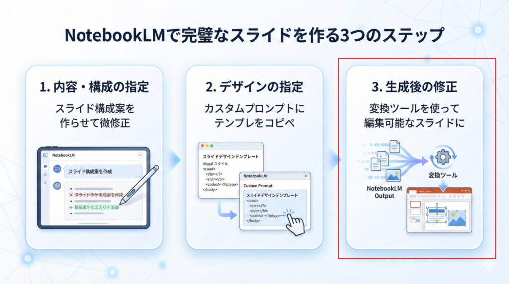 NotebookLMでスライドを実務で使える完成形まで仕上げるには、大きく次の3ステップがあります。