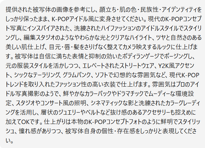 | スタイル変換 | ・写真をイラスト風に変換しても、被写体の特徴は維持 ・「1980年代のレトロ風」「映画のワンシーン風」など、雰囲気だけを変更 ・季節感や時間帯だけを変える(昼→夜、夏→冬など) |