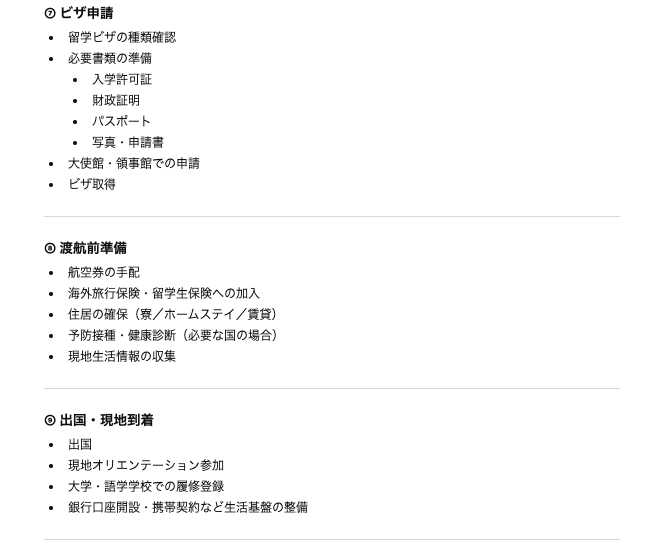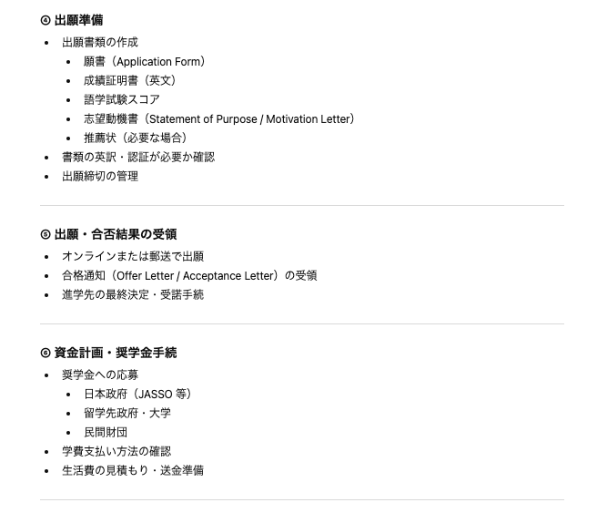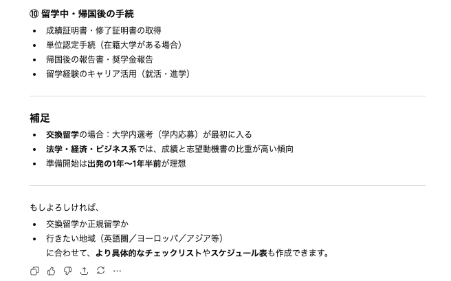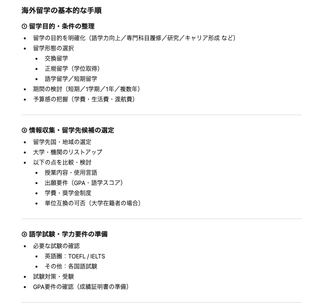 例えば海外留学の手順をマークダウン形式で出力させると以下のような回答が返ってきました。知りたいことが完結にまとまっているので大変わかりやすいですね。