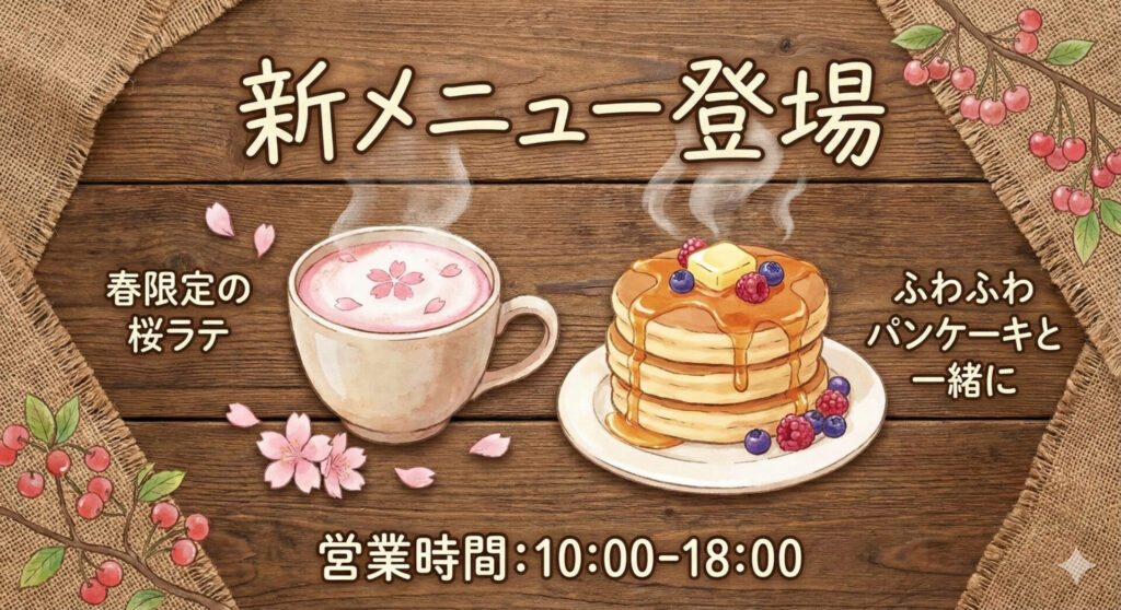 ただし、画像内に日本語文字を入れる場合は、文字が崩れたり意図しない表記になることがあるため、文字の条件(短く・大きく・フォント明確・不要要素を消す)を先に固めるのがコツです。