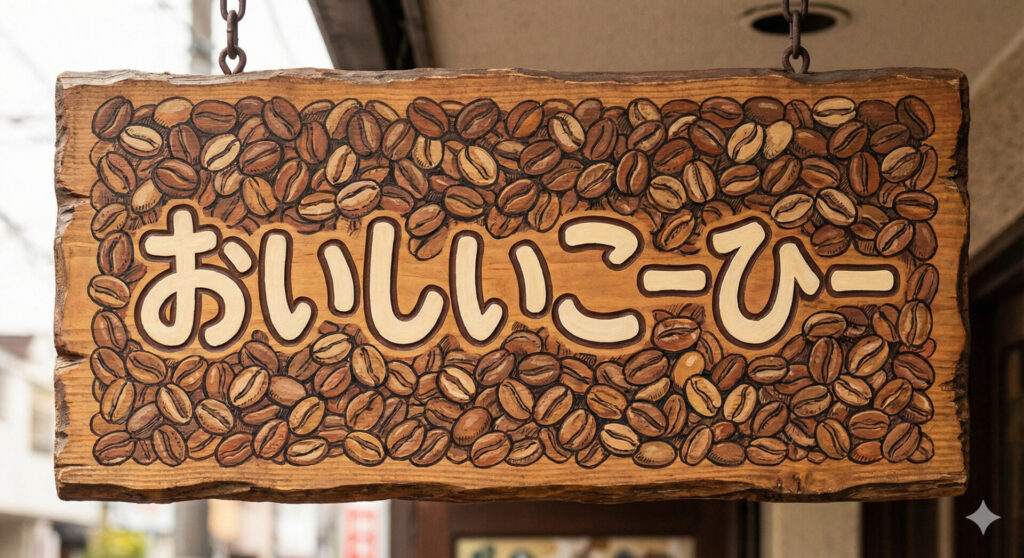 カフェの看板を作ってください。中央に「おいしいコーヒー」という文字を大きく配置。全てひらがなで表示してください。背景はコーヒー豆のイラストで、温かみのある茶色とベージュの配色に。