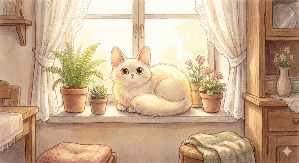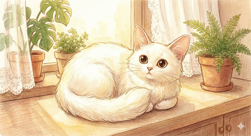 丸い目と大きな耳を持つ白い猫が窓辺でくつろいでいる。柔らかな午後の光が差し込み、猫の毛並みが金色に光っている。背景には観葉植物とレースのカーテン。優しくて温かみのあるイラスト風。
