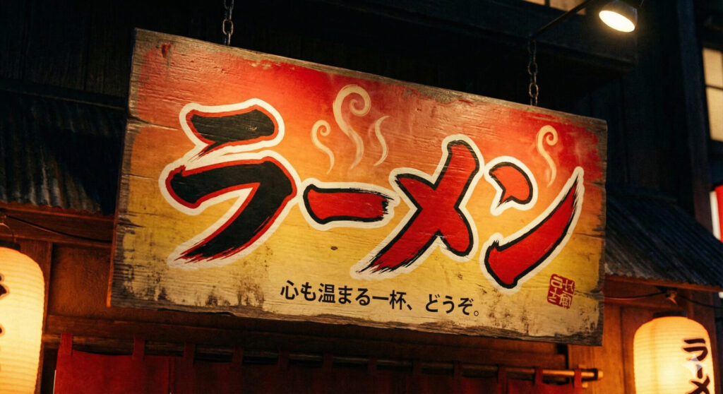 温かみのあるラーメン店の看板を作ってください。看板の中央に「ラーメン」という文字を大きく配置。背景は赤と黄色のグラデーションで、湯気のイラストを添えて。レトロで親しみやすいデザインに。
