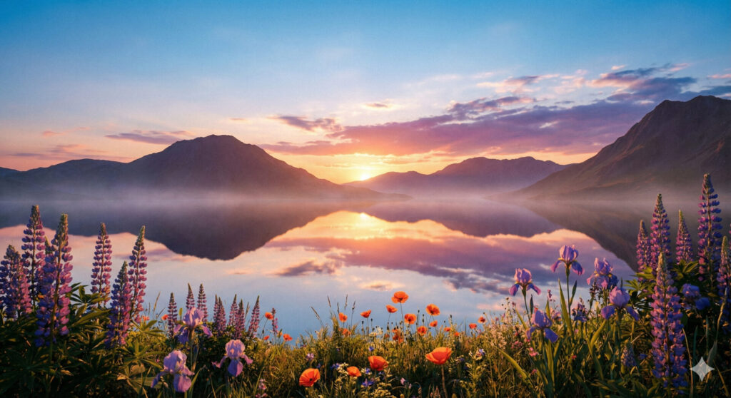 透明感のある青空と、柔らかな夕日の光に包まれた湖畔の風景を作ってください。湖面には雲と山が鏡のように映り込み、手前には野花が咲いている。写実的でありながら、どこか幻想的な雰囲気で。
