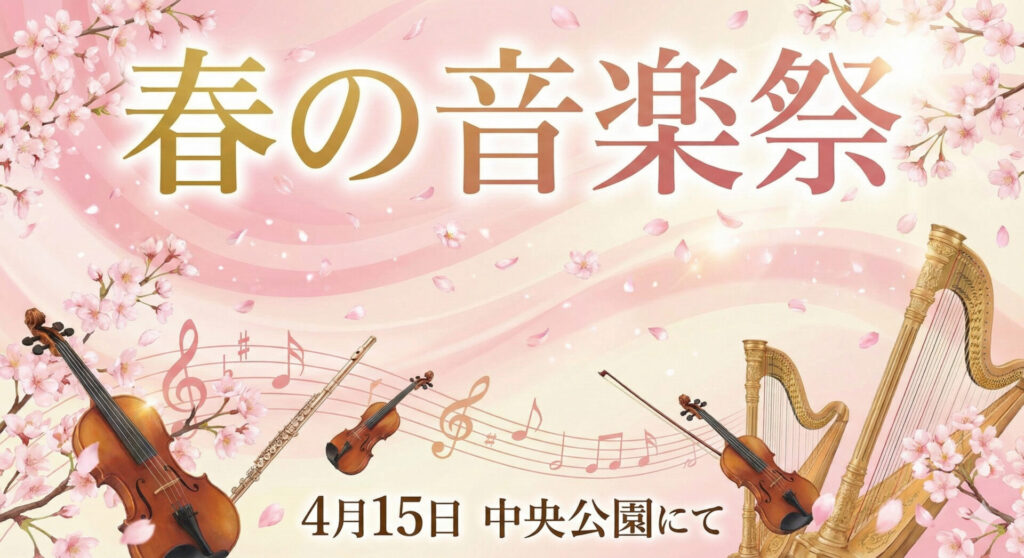 春の音楽イベントのポスターを作成してください。上部に「春の音楽祭」という文字を明朝体で大きく配置。背景は桜の花びらが舞う淡いピンク色。下部に「4月15日 中央公園にて」という小さめの文字。爽やかで華やかな印象に。