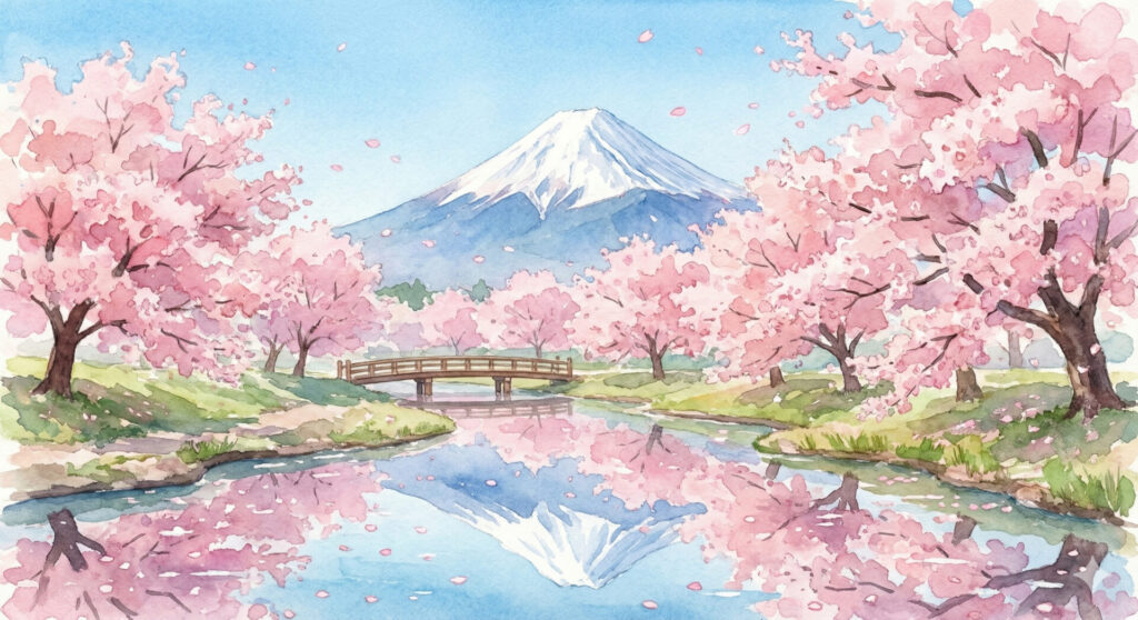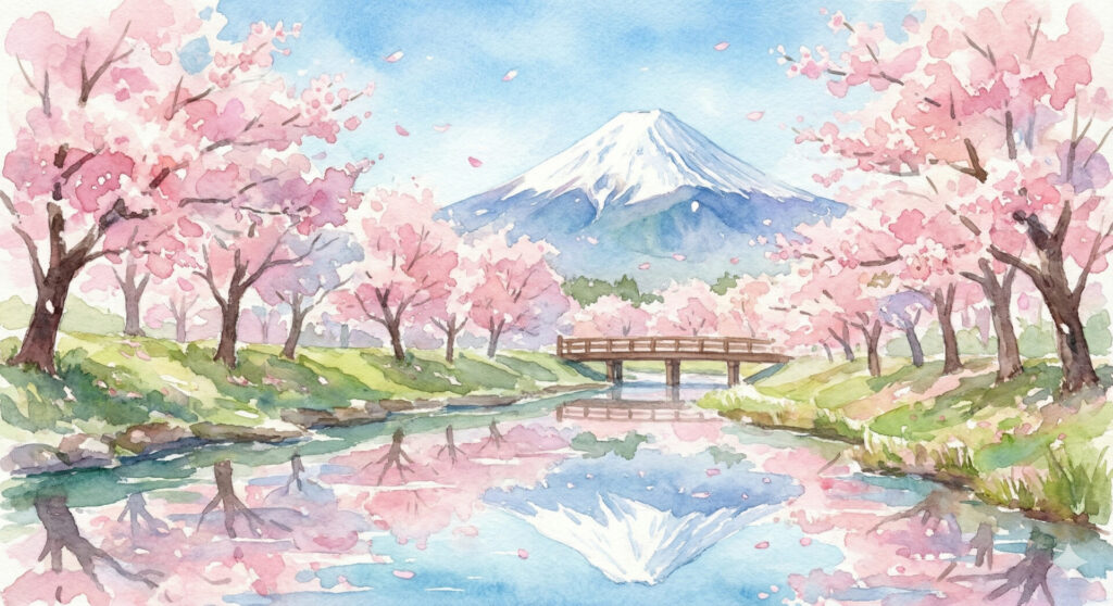 満開の桜と富士山が見える春の風景。青空が広がり、桜の花びらが風に舞っている。手前に小川が流れ、水面に桜と富士山が映り込んでいる。水彩画風の優しいタッチで。