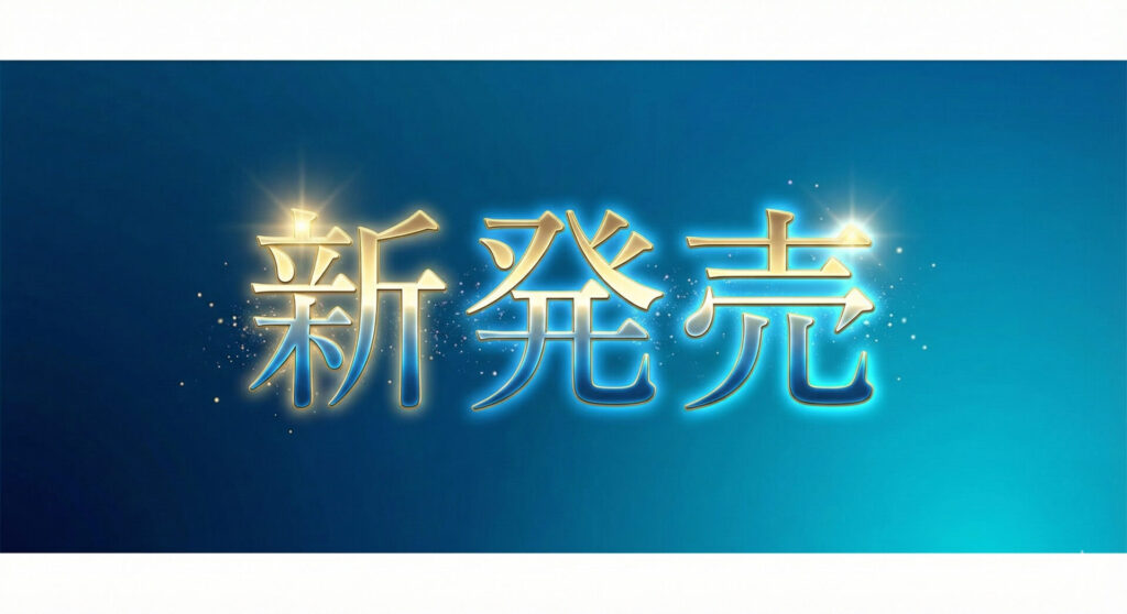 シンプルなバナーを作ってください。中央に「新発売」という3文字だけを大きく配置。明朝体で、文字の周りに光のエフェクトを追加。背景はグラデーションの青色。