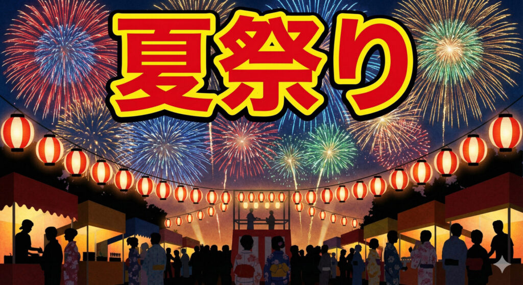 イベント告知ポスターを作成してください。上部に「夏祭り」という文字をゴシック体で大きく太字で配置。文字の輪郭をはっきりさせて、読みやすく。背景は花火と提灯のイラスト。