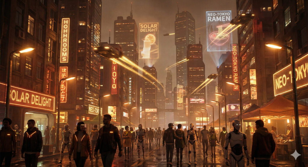 ネオンが輝く未来都市の夜景。高層ビルの間を飛行する車、ホログラム広告が浮かぶ空。地上では人々とロボットが共存している様子。サイバーパンク風でありながら、どこか温かみのある色調で。