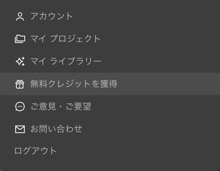 無料クレジットは、画面右上のアカウントアイコン(丸いアイコン)からすぐ確認・獲得できます。
