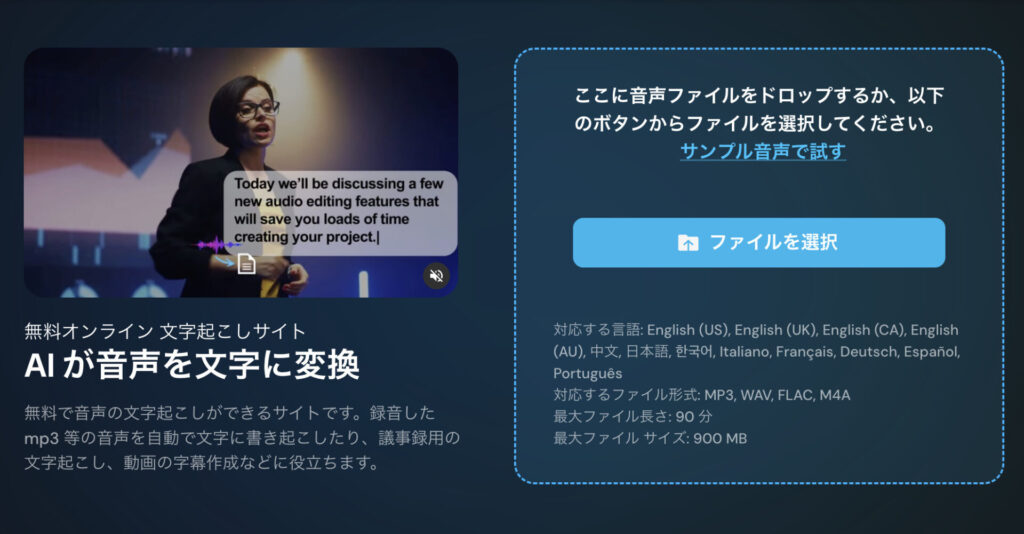 文字起こしは無料で使える案内になっており、回数やクレジットの制限を気にせず試しやすいのが魅力です。