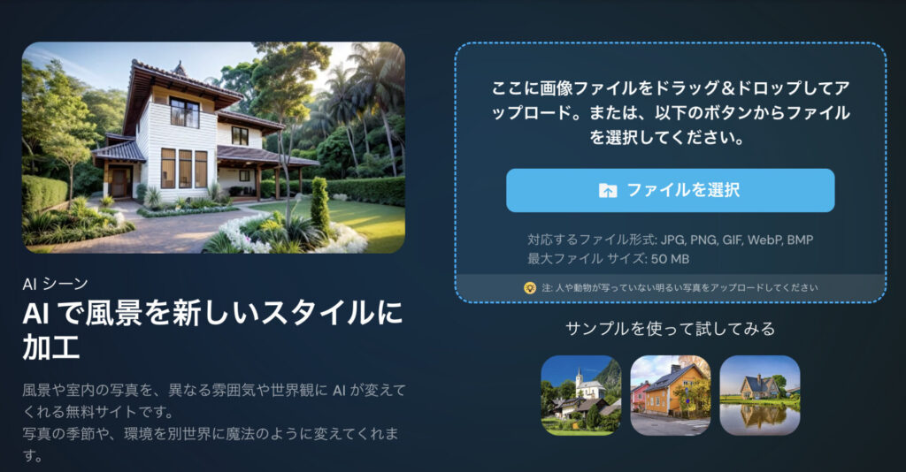風景写真や室内写真の雰囲気を、別のスタイルに変換できる機能です。