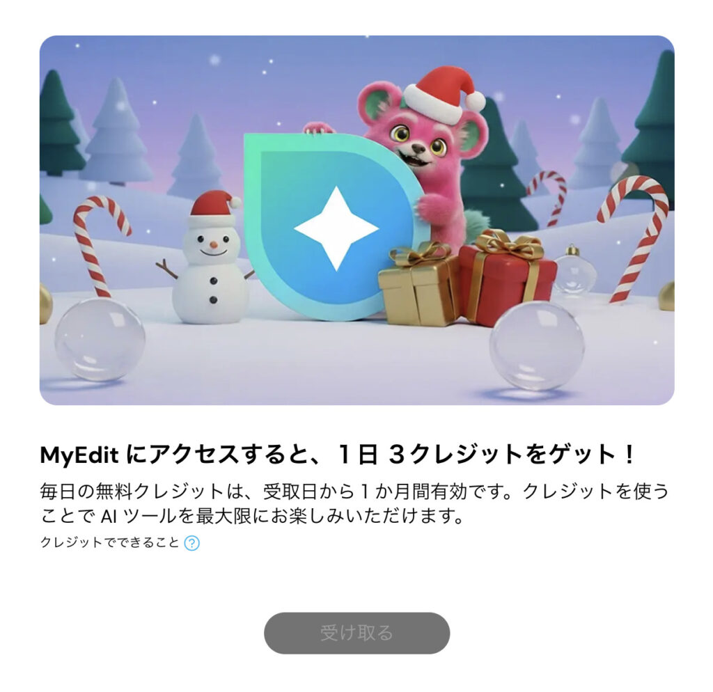 MyEditのAI機能はクレジット制のため、無料版では毎日付与される無料クレジット(3クレジット)の範囲内でしか利用できません。