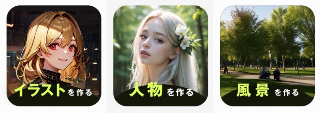 - 生成モード(イラスト/人物/風景)が用意され、簡単に雰囲気に沿った画像が作れる