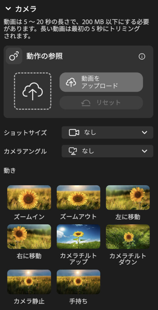 また、単に映像を生成するだけでなく、ショットサイズやカメラアングル、動きといった要素も指定できます。