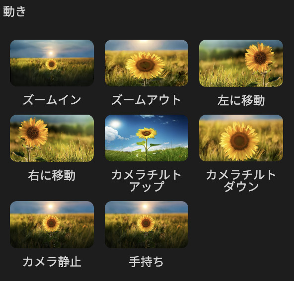 - 右に移動:カメラが右方向へスライド。左移動と同じく“流れ”が作れる