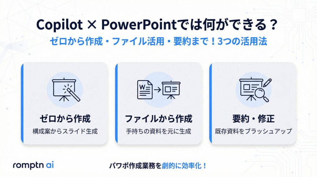 以下では「Copilot × PowerPoint」で出来ることの中で特に有用な3つの使用法について解説します。