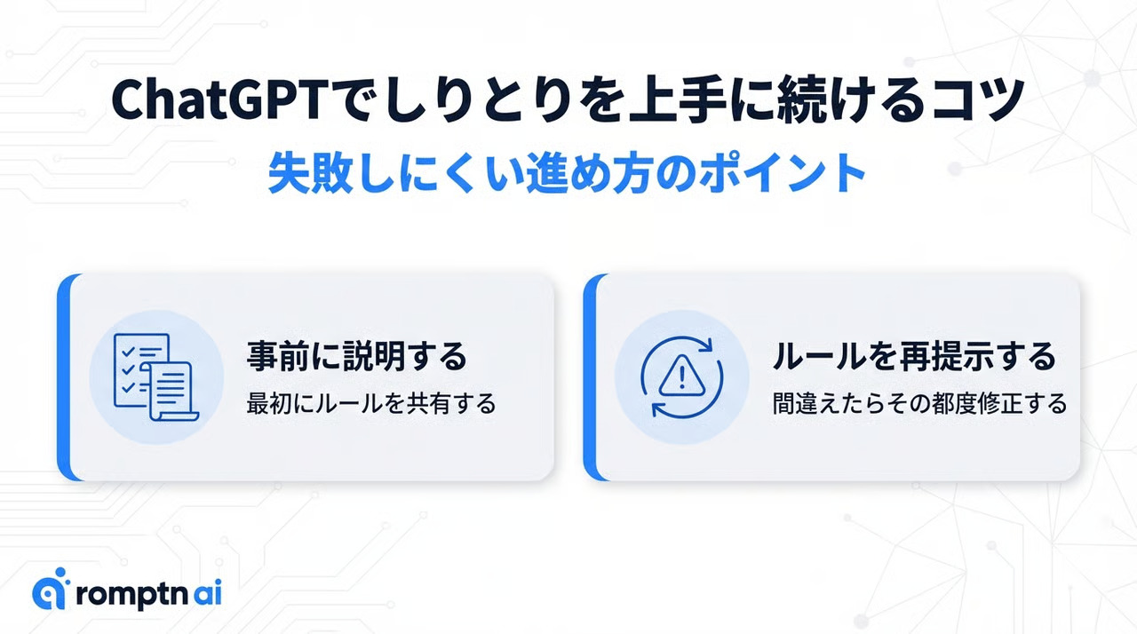 ChatGPTでしりとりを上手に続けるためには、誤った回答をした際はルールを再提示することが重要です。