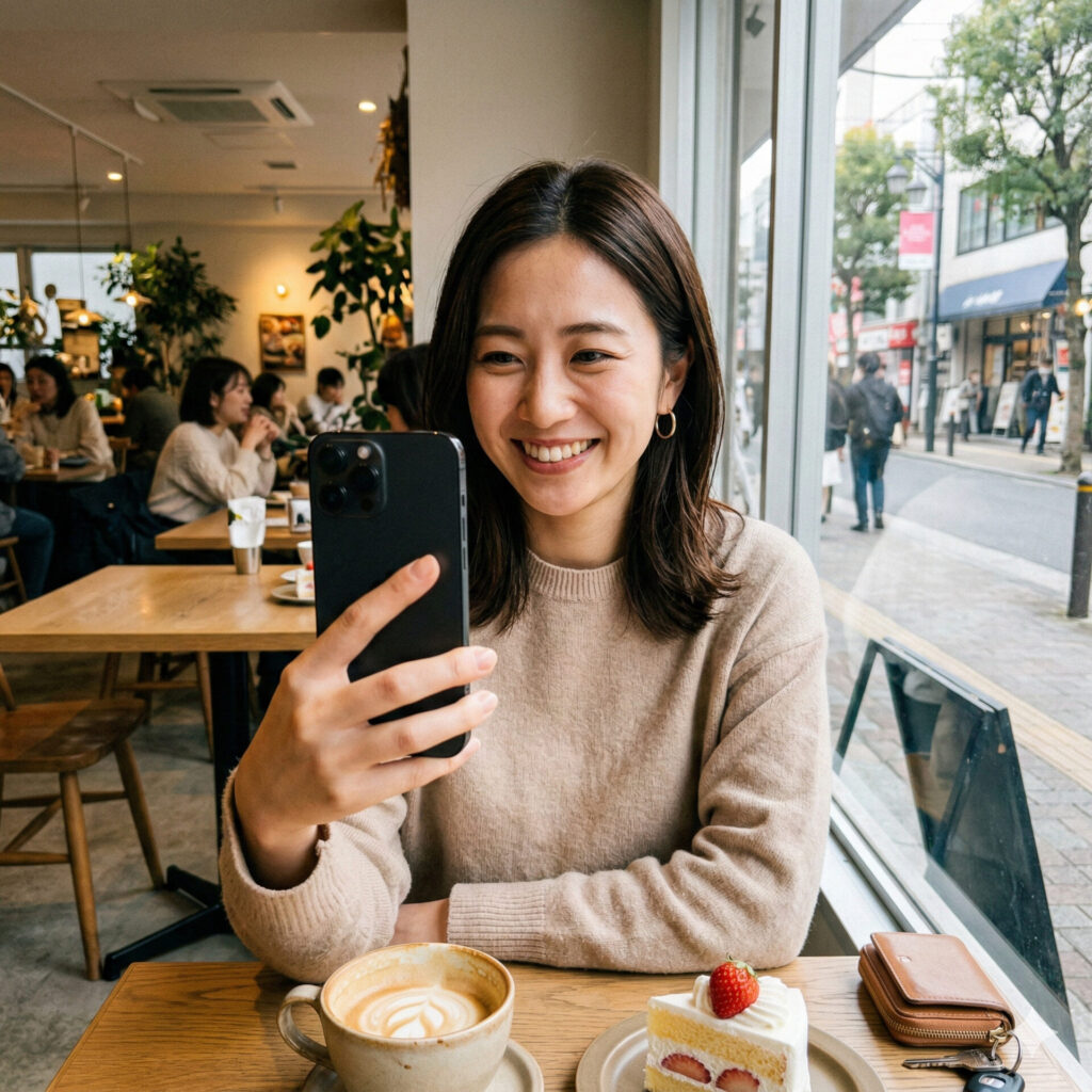 aspect_ratio_1_1でスマホで撮影したような実写風の日本人女性の画像を生成して。