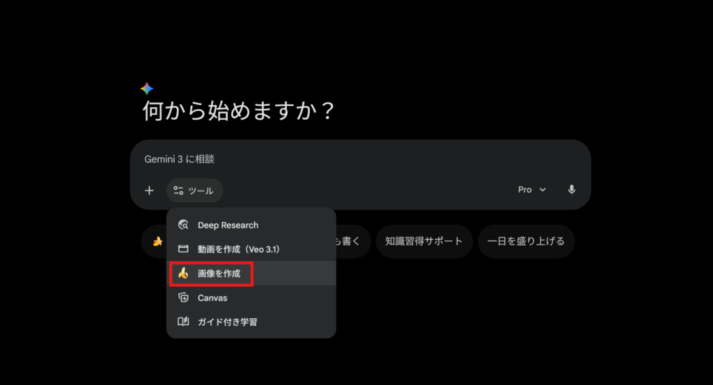 Geminiを開いたらツールの中から「画像を作成」を選択します。